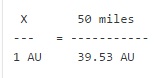 where x = the scaled distance from the earth to the sun in miles. Do the math to get: (50 miles x 1 AU) / 39.53 AU = 1.26 AU