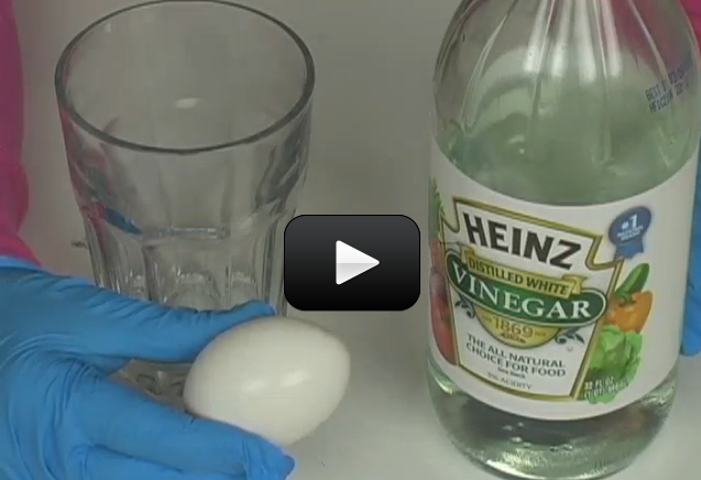 When you first plop the egg in the vinegar, do you notice the tiny bubbles? The acetic acid (distilled vinegar) reacts with the calcium carbonate in the eggshell, and you may even notice a color change over a couple of days.